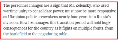 Ex Prime Minister Shmyhal turned Defense Minister is now Energy Minister. Military Intelligence chief Budanov will run the President’s Office, and Digital Transformation Minister Fedorov will be put in charge of the Defense Ministry. The as yet un-arrested Yermak (ex head of the President’s Office) still lurks in the shadows, and State Security Service of Ukraine (SBU) chief Vasyl Maliuk has tendered his resignation, reportedly.
