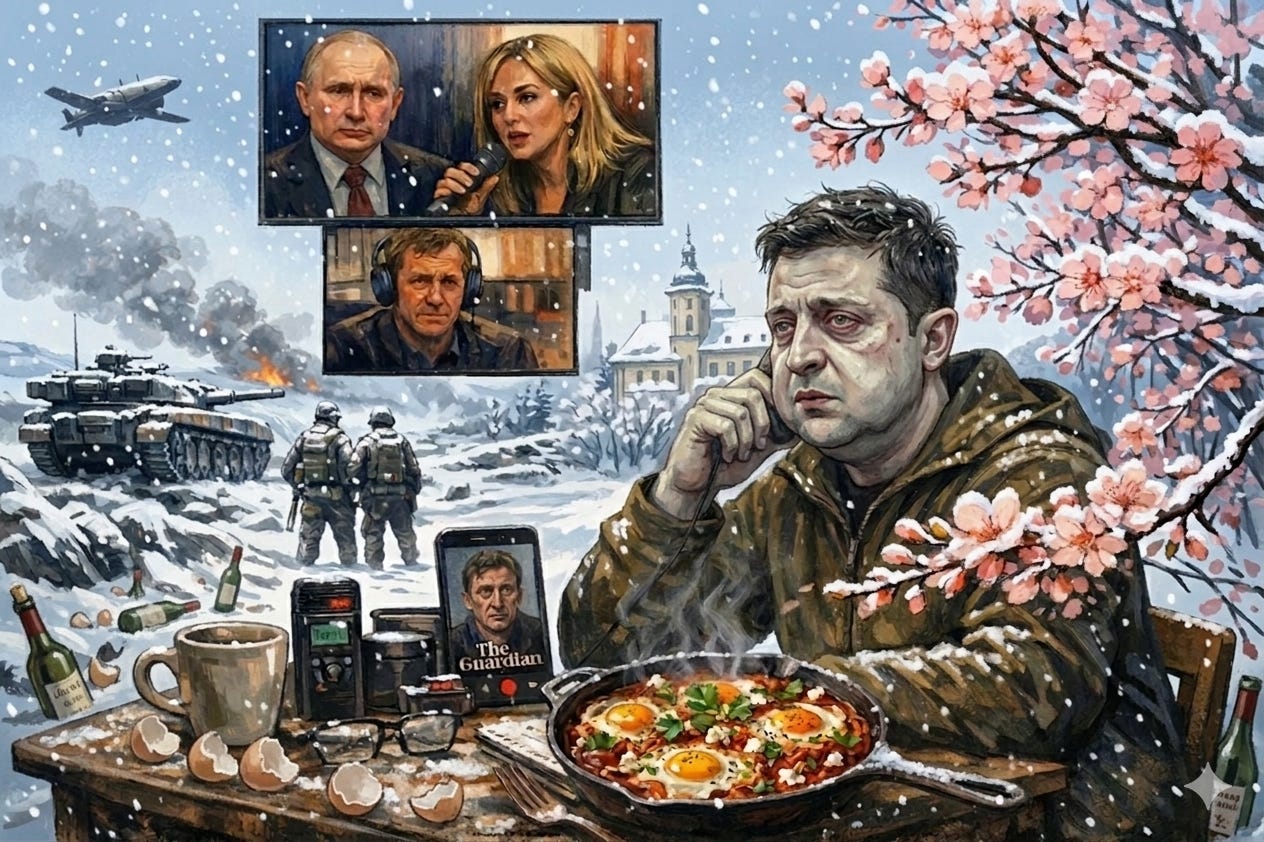 The Campbell conversation itself has texture, though much of that is Campbell’s doing. Z’s English, once serviceable, is now genuinely difficult in places — as if the language itself has begun to tire. And yet the charge of circular reasoning undersells what is, at moments, sharp analysis. His three-part test for whether Putin wants peace — a trilateral leaders’ summit, American troops on the contact line, the absurdity of a man with seventeen million square kilometres demanding six thousand more — is structured and, probably, correct. His reading of Putin’s real objective as time, not territory, is more sophisticated than much Western commentary, and certainly more so than the credulous stenography currently passing for analysis at certain distinguished mastheads.